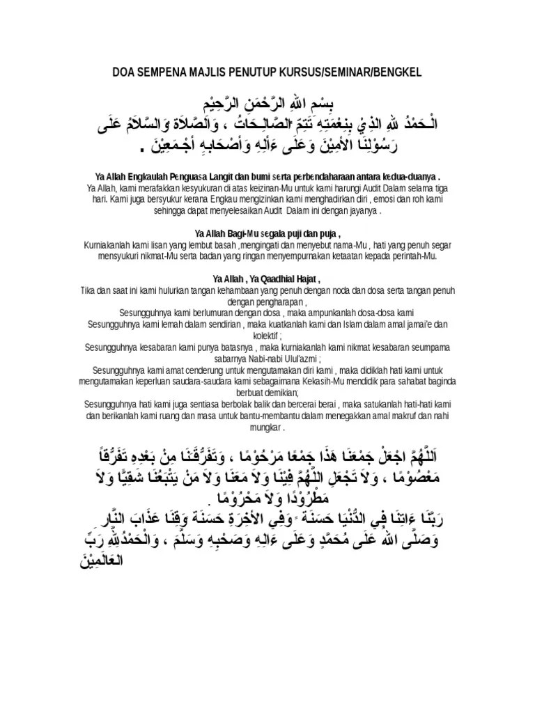 Doa sempena majlis penutup kursus/seminar/bengkel مِ ا سِْم بِ اهللِ ا انِ ا مَِن حِْم رَّ المِ ا يِْمحِ ا . Limpahan nikmat dan rahmat serta diberikan keizinan dihari yang berbahagia ini dapatlah kami berhimpun bersempena majlis penutup kursus (. Doa sempena majlis penutupan kursus ,. Allahumma antal azizul jalil, ya allah. Bacaan doa bersempena dengan majlis penutup bengkel seminar kursus di sekolah. Doa sempena majlis penutup kursus. Sebagai contohnya, bacaan doa bersempena dengan majlis penutup bengkel / seminar / kursus di sekolah. Tak lengkap rasanya, jika sesuatu . Doa sempena majlis penutup kursus/seminar/bengkel doa sempena majlis penutup kursus/seminar/bengkel بِسْمِ اللهِ الرَّحْمَنِ الرَّحِيْمِ… Doa sempena majlis penutupan kursus.